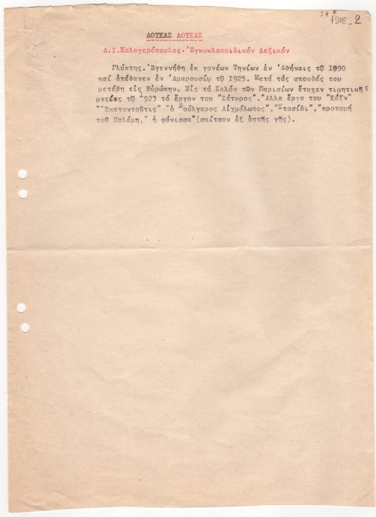 Κείμενο, δακτυλόγραφο, χαρτί, 30,0×22,0 εκ., στα ελληνικά. Αποδελτίωση εγκυκλοπαιδικού λήμματος για τον καλλιτέχνη.