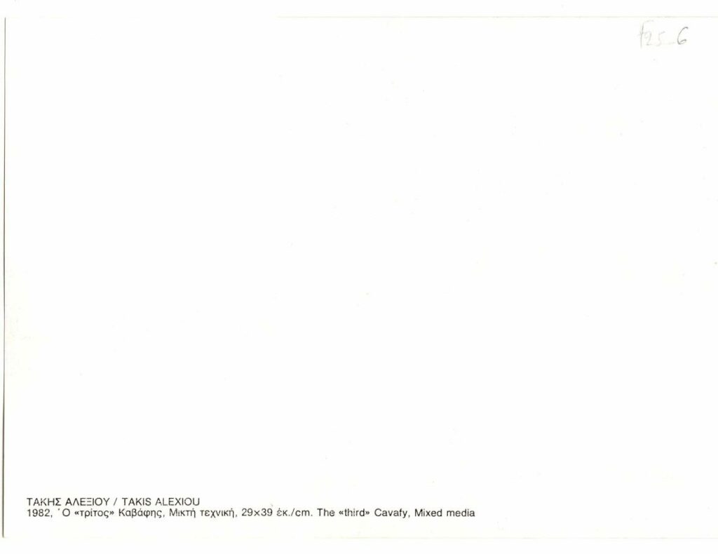 Κάρτα, χαρτόνι, 13,5×19εκ, σε ελληνικά και αγγλικά με αναπαραγωγή έργου του Τάκη Αλεξίου.