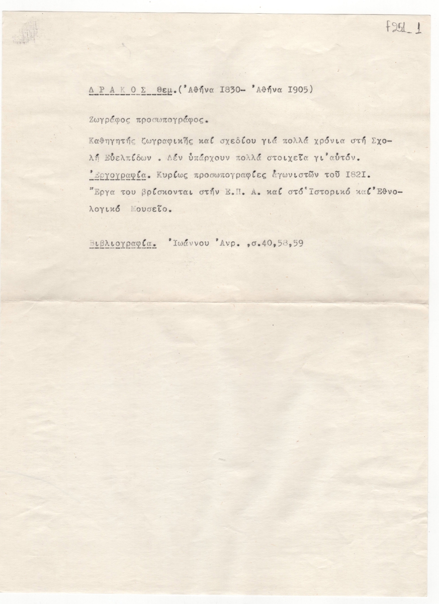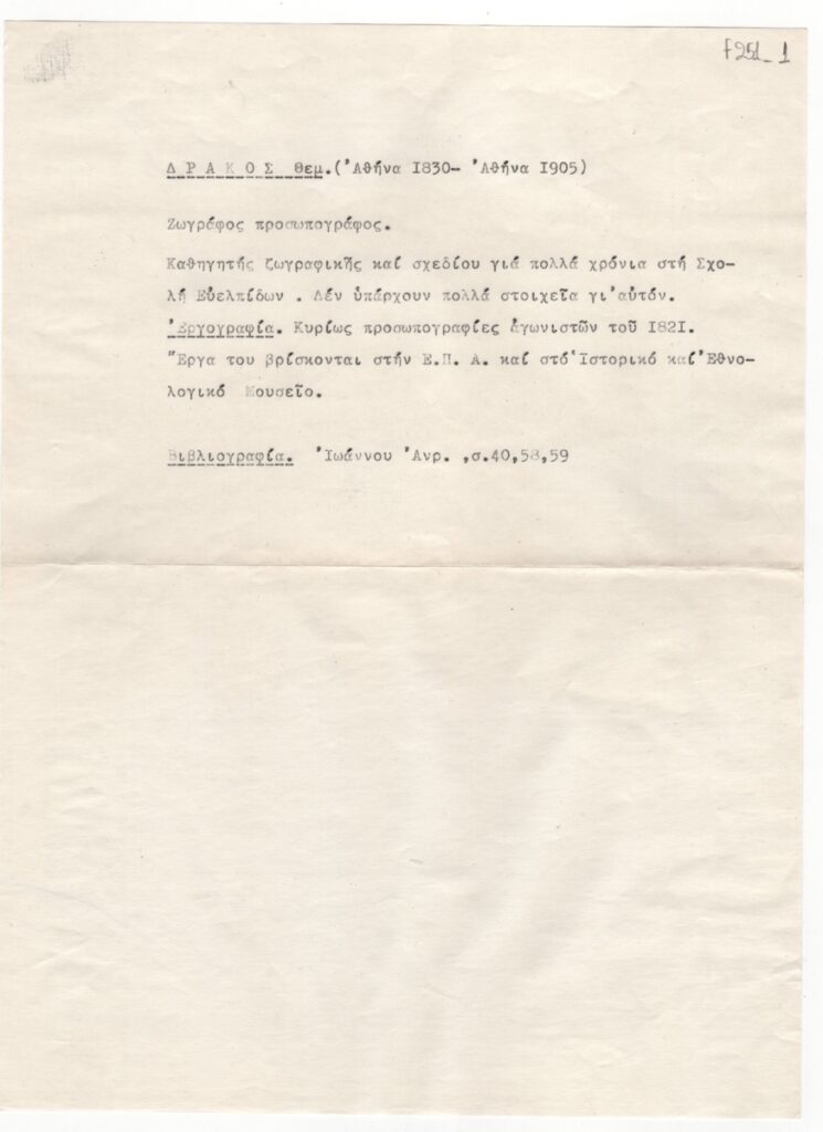 Κείμενο, δακτυλόγραφο, χαρτί, 30,0×21,3 εκ., στα ελληνικά. Αναφέρονται στοιχεία για τον καλλιτέχνη, εργογραφία και βιβλιογραφία.