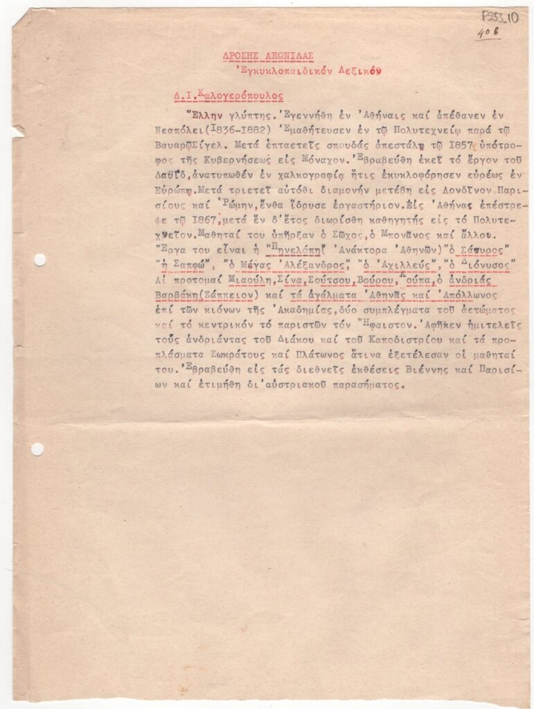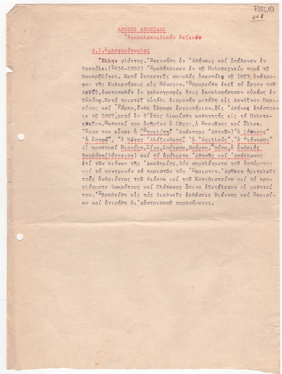 Κείμενο, δακτυλόγραφο, στα ελληνικά, χαρτί, 29,5×22,0 εκ. Αποδελτίωση λήμματος του Δ. Ι. Καλογερόπουλου για τον καλλιτέχνη. Αναφέρονται σπουδές, βραβεία και έργα.