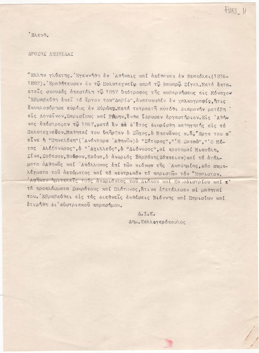 Κείμενο, δακτυλόγραφο, στα ελληνικά, χαρτί, 29,0×21,4 εκ. Λήμμα του Δ. Ι. Καλλογερόπουλου για τον καλλιτέχνη, Αναφέρονται σπουδές, έργα και βραβεία.