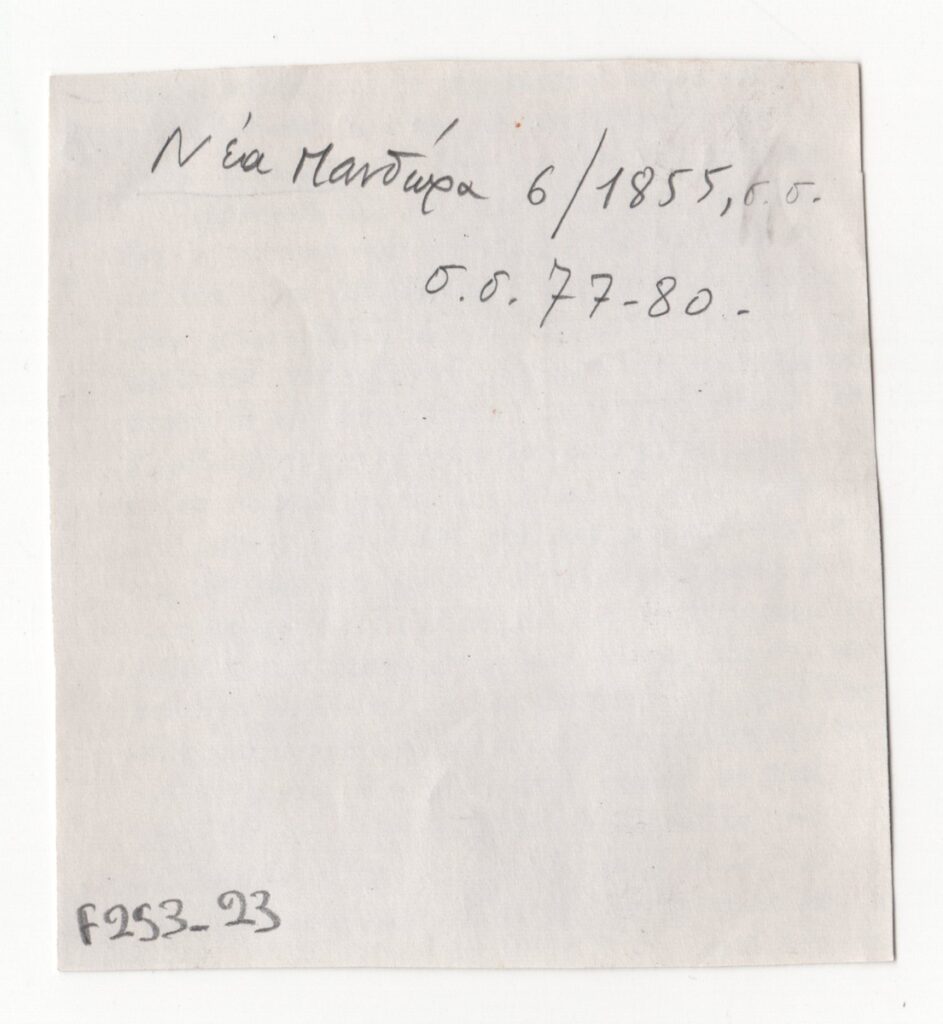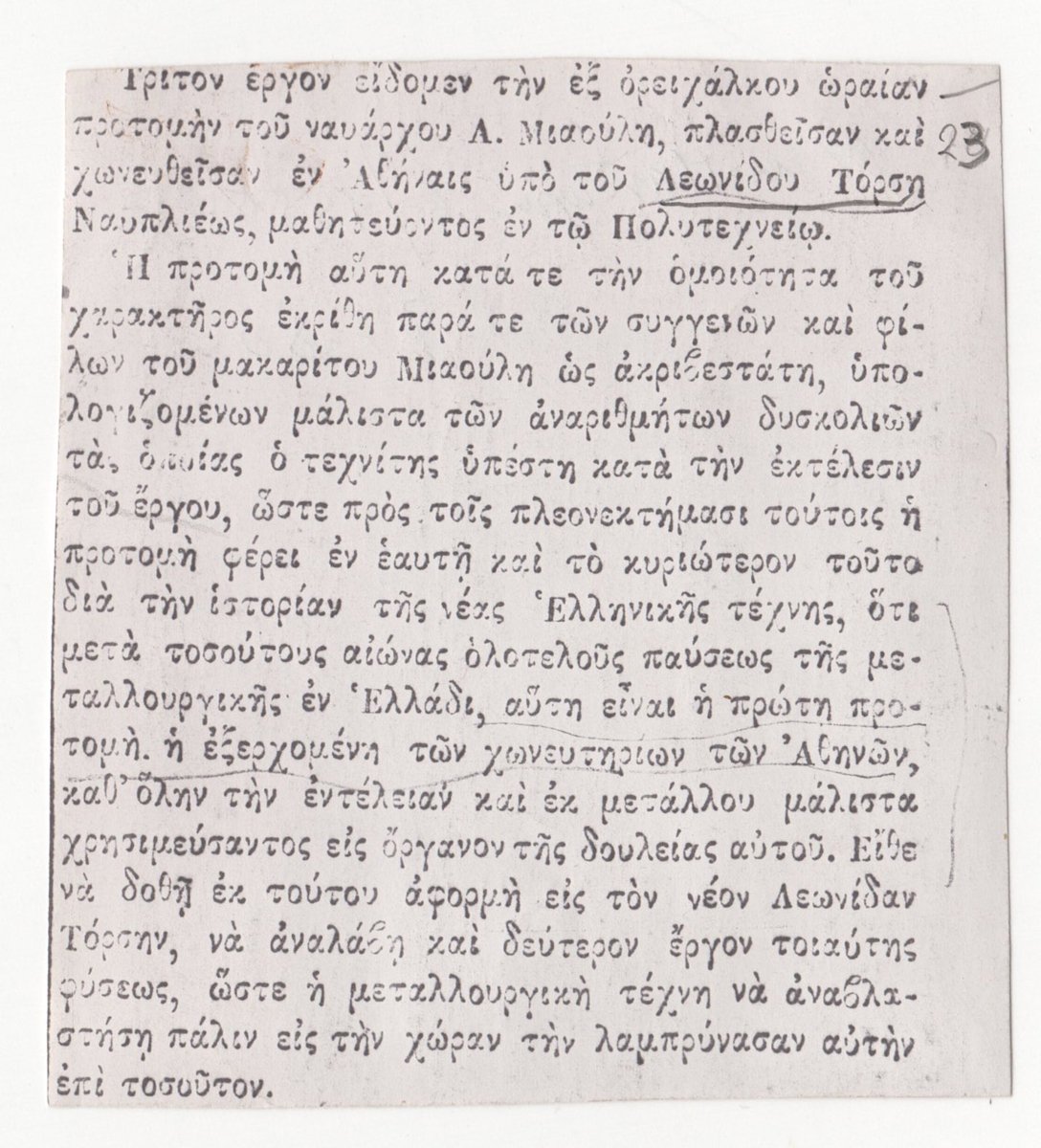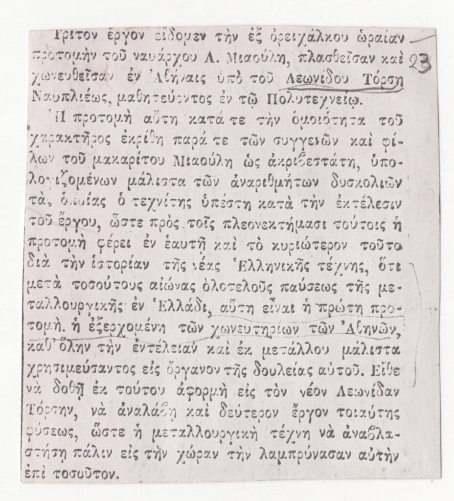Φωτοαντίγραφο αποκόμματος εντύπου, χαρτί, 9,0×8,5 εκ., στα ελληνικά. Το δημοσίευμα αφορά την φιλοτέχνηση ορειχάλκινης προτομής του ναυάρχου Μιαούλη από τον καλλιτέχνη. Στην πίσω όψη επιγραφή δίνει την πηγή του δημοσιεύματος.