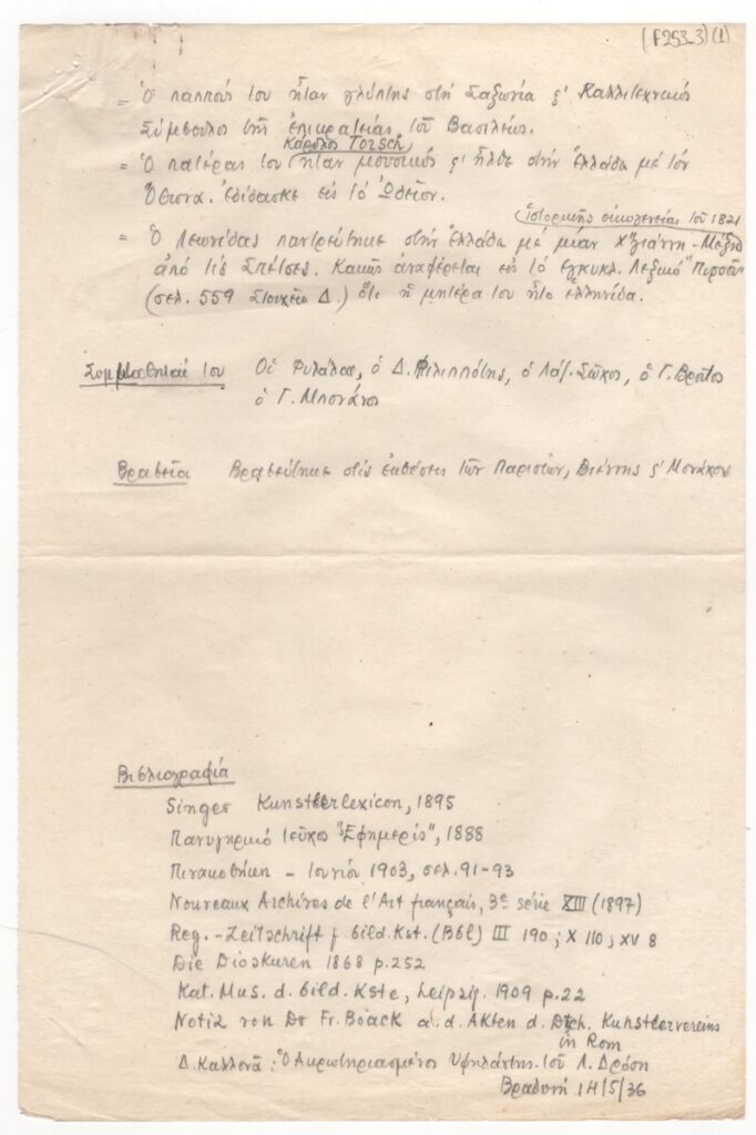 Κείμενο, χειρόγραφο, με μολύβι, στα ελληνικά, χαρτί, 2 φφ, 30,0×20,0 εκ. Αναφέρονται σύντομα βιογραφικά στοιχεία, σπουδές, έργα του, συγγενικά πρόσωπα, συμμαθητές, βραβεία και βιβλιογραφία.