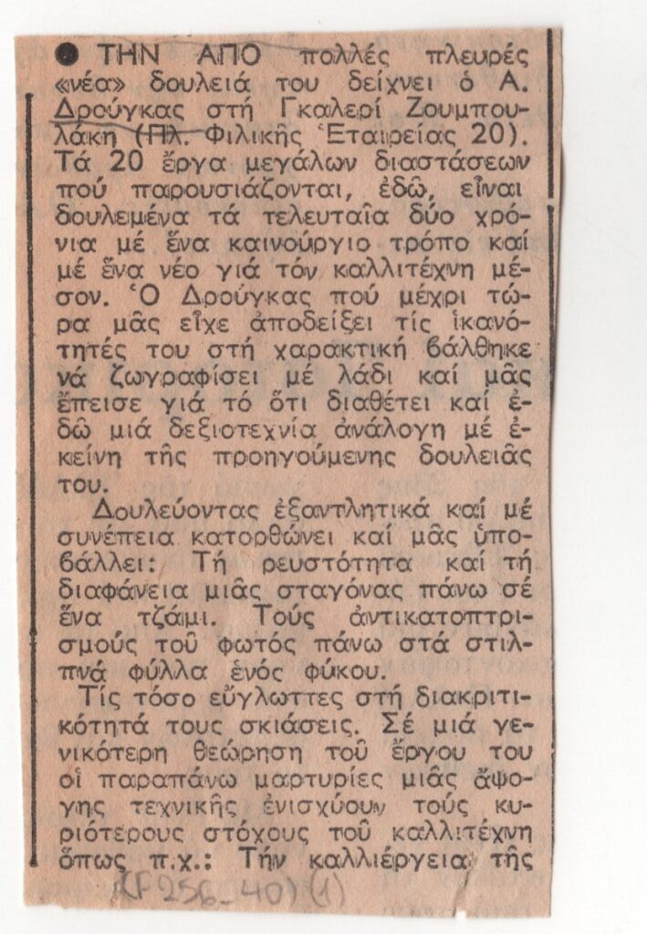 Αποκόμματα εφημερίδας, χαρτί, 2 φφ, 8,7×5,2 και 10,0×5,7 εκ., στα ελληνικά. Κριτική του Ντ. Ηλιοπούλου Ρογκάν για την ατομική έκθεση ζωγραφικής του καλλιτέχνη στην Αθήνα το 1978.