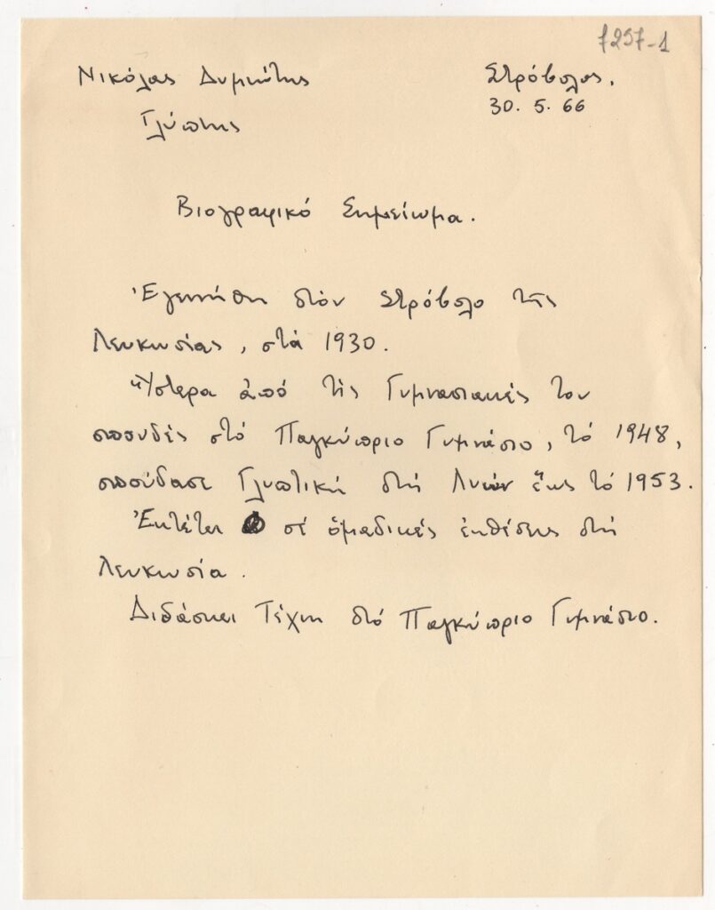 Βιογραφικό, χειρόγραφο, χαρτί, 18×13 εκ., με μαύρο μελάνι, στα ελληνικά, του Νικόλα Δυμιώτη.