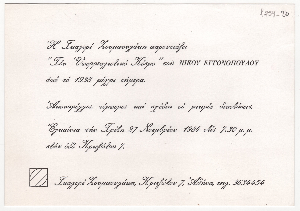Έντυπο, στα ελληνικά, χαρτόνι, 13,7×19,7 εκ. Πρόσκληση στην έκθεση έργων του Νίκου Εγγονόπουλου με ακουαρέλλες, τέμπερες και σχέδα από το 1938 κ.ε. στην Αθήνα το 1984.