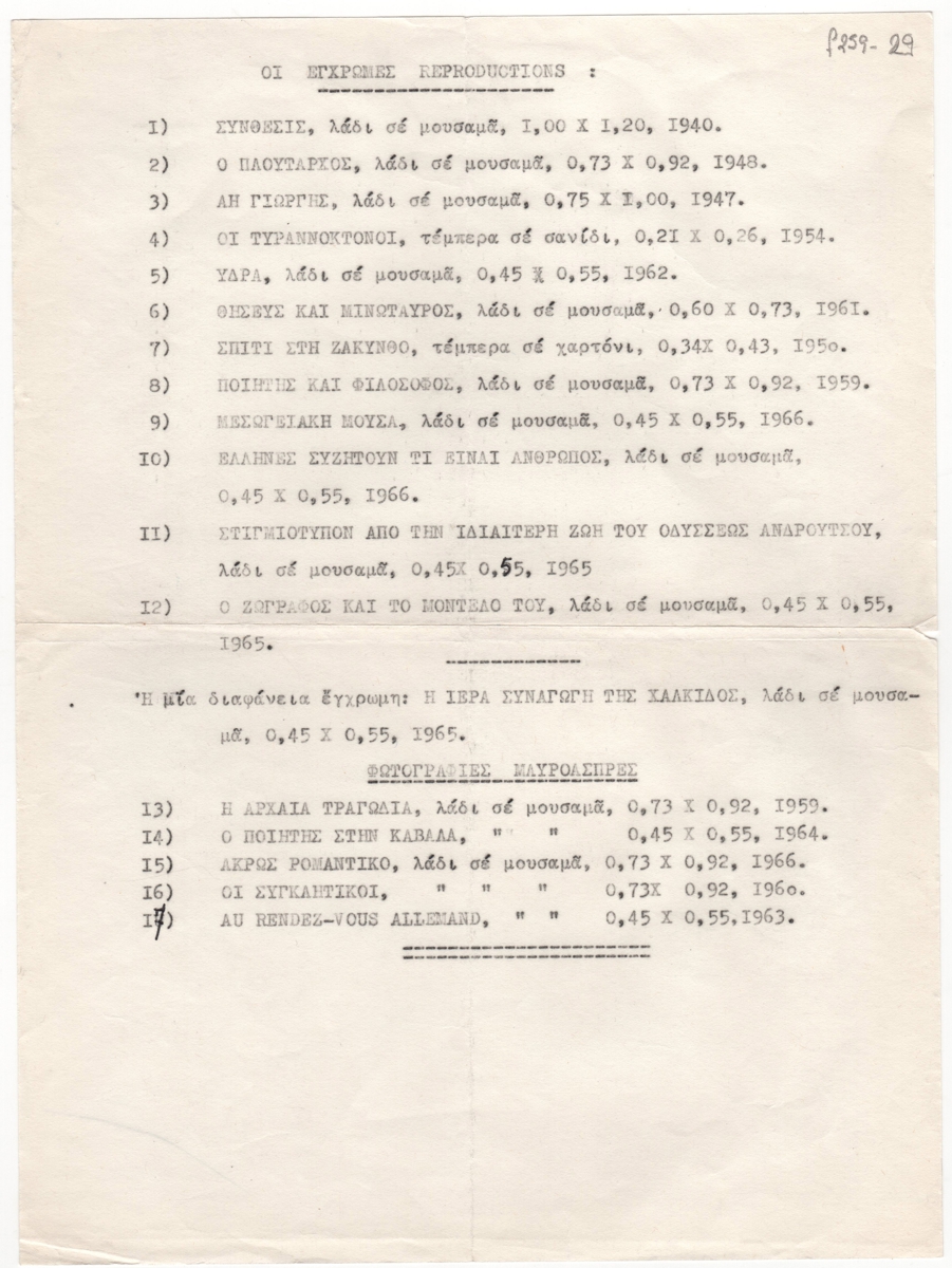 Κείμενο, δακτυλόγραφο, στα ελληνικά, σε χαρτί, 28,6×21,2 εκ. Κατάλογος έγχρωμων και ασπρόμαυρων αναπαραγωγών 17 έργων του καλλιτέχνη.