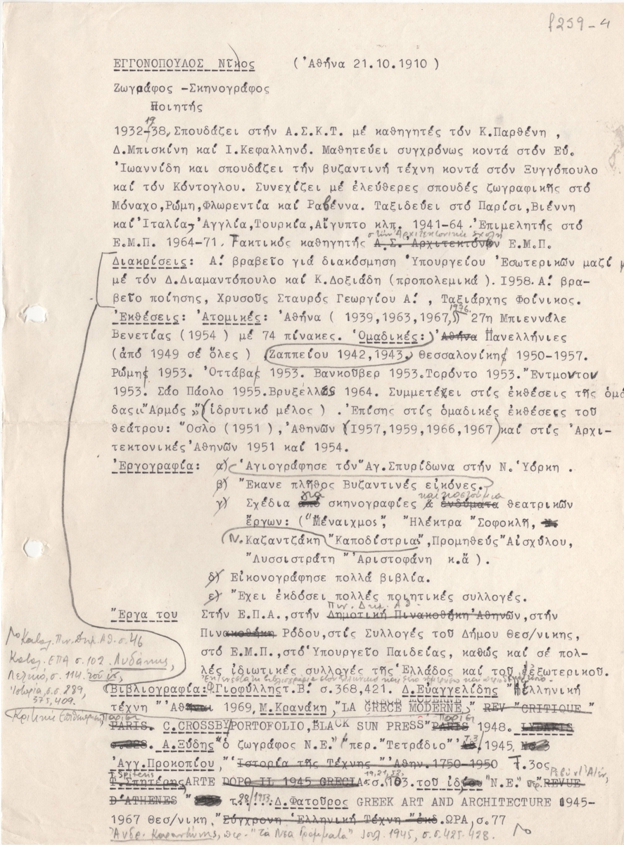 Κείμενο, δακτυλόγραφο, με σημειώσεις και συμπληρώσεις, χειρόγραφες, με μολύβι, στα ελληνικά, σε χαρτί, 28,5×21,3 εκ. Περιλαμβάνει σπουδές, ατομικές εκθέσεις, εργογραφία, έργα του και βιβλιογραφία.