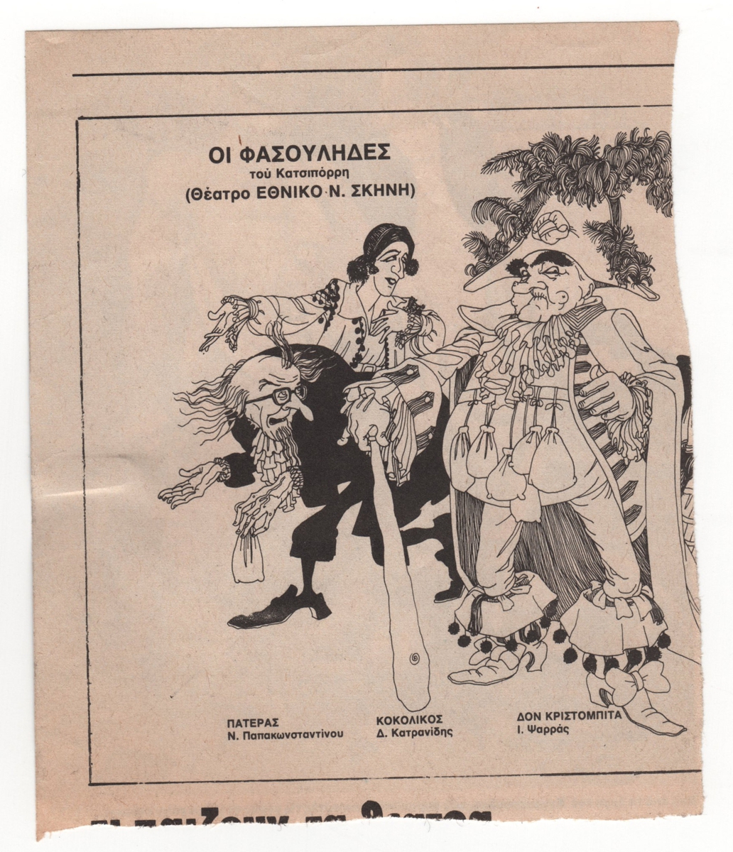 Απόκομμα εντύπου, χαρτί, 13,0×11,0 εκ. Διαφήμιση της παραγωγής της Νέας Σκηνής του Εθνικού Θεάτρου “Οι φασουλήδες του Κατσιπόρρη” του Federico Garcia Lorca με τον Ν. Παπακωνσταντίνου στον ρόλο του Πατέρα, τον Δ. Κατρανίδη στον ρόλο του Κοκολίκου και τον Ι. Ψαρράς στον ρόλο του Κριστομπίτα. Τα εικονιζόμενα κοστούμια έχουν σχεδιαστεί από τον Διονύση Φωτόπουλο.