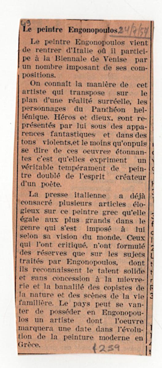 Απόκομμα εφημερίδας (24/04/1954). Δημοσίευμα σχετικά με τη συμμετοχή του καλλιτέχνη στην Μπιενάλε της Βενετίας.