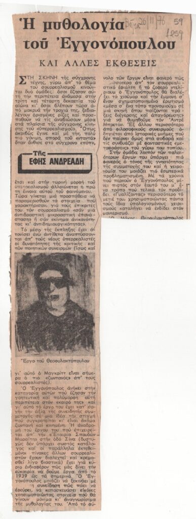 Απόκομμα της εφημερίδας “Το Βήμα” (26/11/1976), όπου δημοσιεύεται κριτική έκθεσης του Ν. Εγγονόπουλου στο Βιβλιοπωλείο “Gazette” στην Αθήνα.