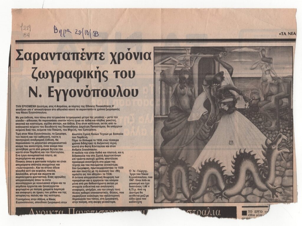 Απόκομμα της εφημερίδας “Τα Νέα” (29/10/1983). Αναφορά στην αναδρομική έκθεση του Ν. Εγγονόπουλου στην Εθνική Πινακοθήκη.