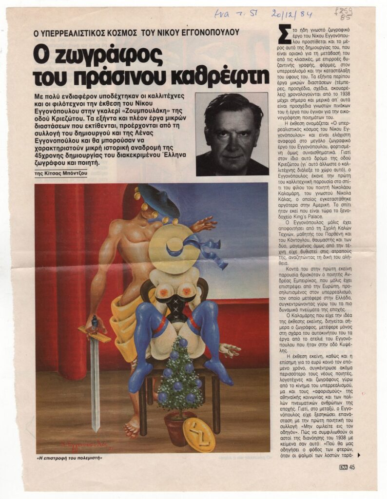 Απόκομμα του περιοδικού “Ένα” (20/12/1984). Άρθρο της Κίτσας Μπόντζου σχετικά την έκθεση έργων μικρών διαστάσεων στην Αθήνα το 1984. Περιέχει αναδρομή στο έργο του, αποσπάσματα ποιημάτων και συνέντευξής του καλλιτέχνη και του Οδυσσέα Ελύτη.