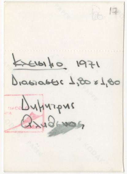 Φωτογραφία, έγχρωμη, σε φωτογραφικό χαρτί Kodak, 8,8×6,2 εκ. Αναπαραγωγή έργου του Δ. Αληθεινού. Στην πίσω όψη επιγραφή με τα στοιχεία του έργου.