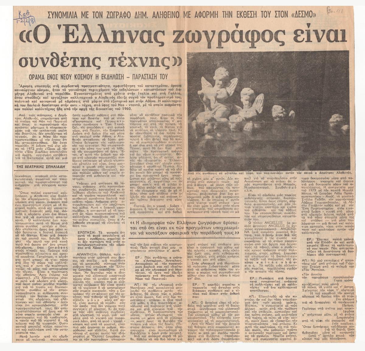 Απόκομμα, έντυπο, χαρτί, 30,0×30,0 εκ., όπου δημοσιεύεται, στα ελληνικά, κριτικό σημείωμα της Βεατρίκης Σπηλιάδη για το έργο Δημήτρη Αληθεινού με αφορμή την έκθεση έργων του στην Αθήνα το 1981. Στην άλλη όψη, σκακιστικά νέα. Επάνω, επιγραφή με τα στοιχεία της δημοσίευσης.