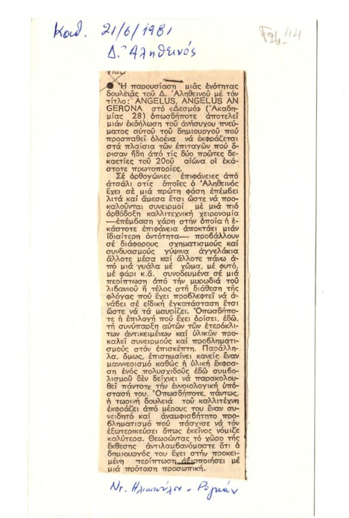 Απόκομμα, έντυπο, χαρτί, 14,0×5,2 εκ., όπου δημοσιεύεται, στα ελληνικά, κριτικό σημείωμα της Ντ. Ηλιοπούλου-Ρογκάν για την ατομική έκθεση έργων του Δ. Αληθεινού στην Αθήνα το 1981. Βρέθηκε συρραμμένο στην πίσω όψη εντύπου έκθεσης του Τάκη Παρλαβάντζα. Πάνω και κάτω από το απόκομμα, επιγραφή.