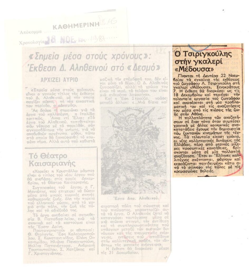 Απόκομμα, έντυπο, χαρτί, 9,1-15,0×15,2 εκ. (ακανόνιστο σχήμα), όπου δημοσιεύεται, στα ελληνικά, άρθρο για την ατομική έκθεση έργων του Λ. Τσιργκούλη στην Αθήνα το 1982. Στο ίδιο απόκομμα περιέχονται άρθρα για την έκθεση του Δ. Αληθεινού στην Γκαλερί “Δεσμός” καθώς και για την παραγωγή του έργου του Γ. Μανιώτη “Χορεύει η Κρουστάλλω μάμπο” από το Θέατρο Καισαριανής. Επικολλημένο απόκομμα με τύπωμα, σφραγίδα και χειρόγραφη σημείωση όπου δίνονται τα στοιχεία της πηγής.