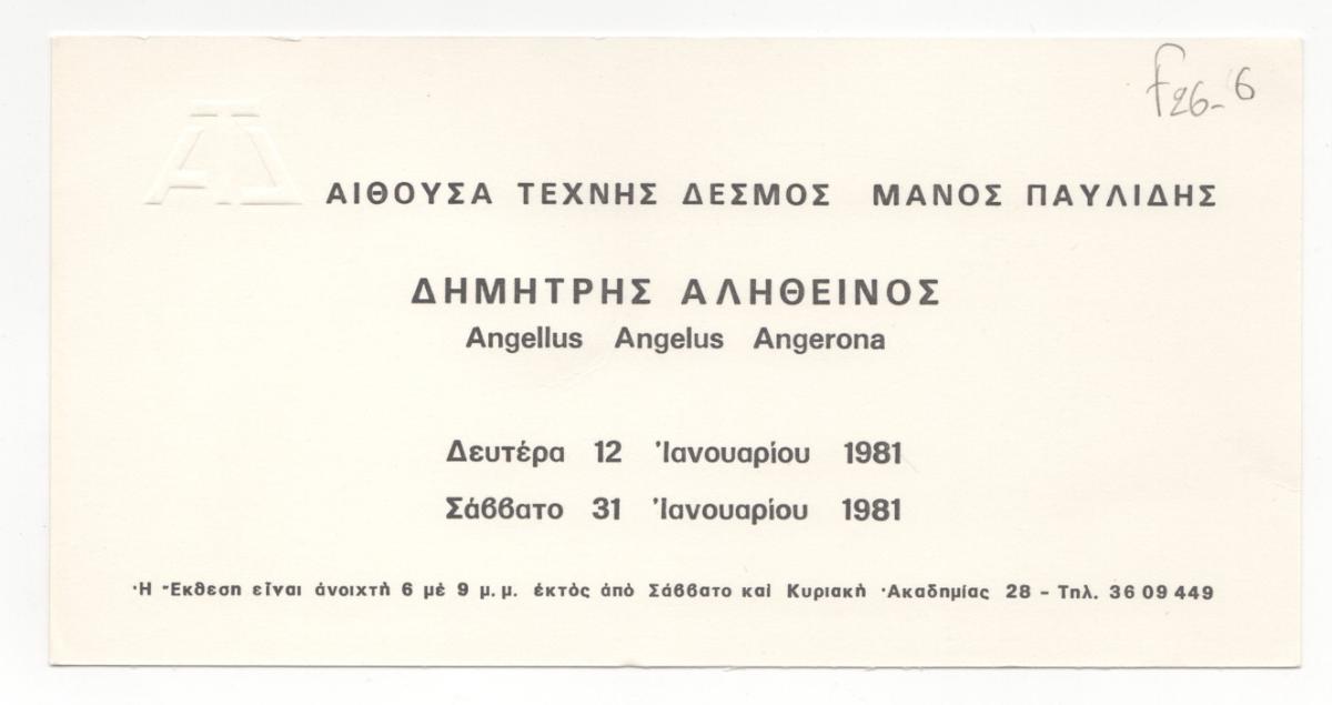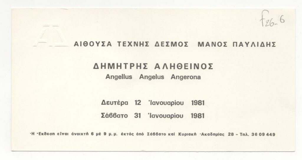 Έντυπο, στα ελληνικά, μονόφυλλο, χαρτόνι, 10,0×19,7 εκ. Πρόσκληση της ατομικής έκθεσης του Δημήτρη Αληθεινού στην Αθήνα το 1981.