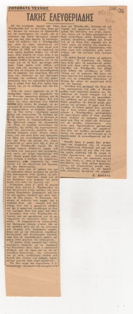 Απόκομμα, χαρτί, 26×11 εκ., στα ελληνικά, δημοσίευσης άρθρου αναφερόμενου στο καλλιτεχνικό έργο του Τάκη Ελευθεριάδη. Εντάσσεται στη στήλη “Ζητήματα Τέχνης” του εντύπου και φέρει επιγραφές.