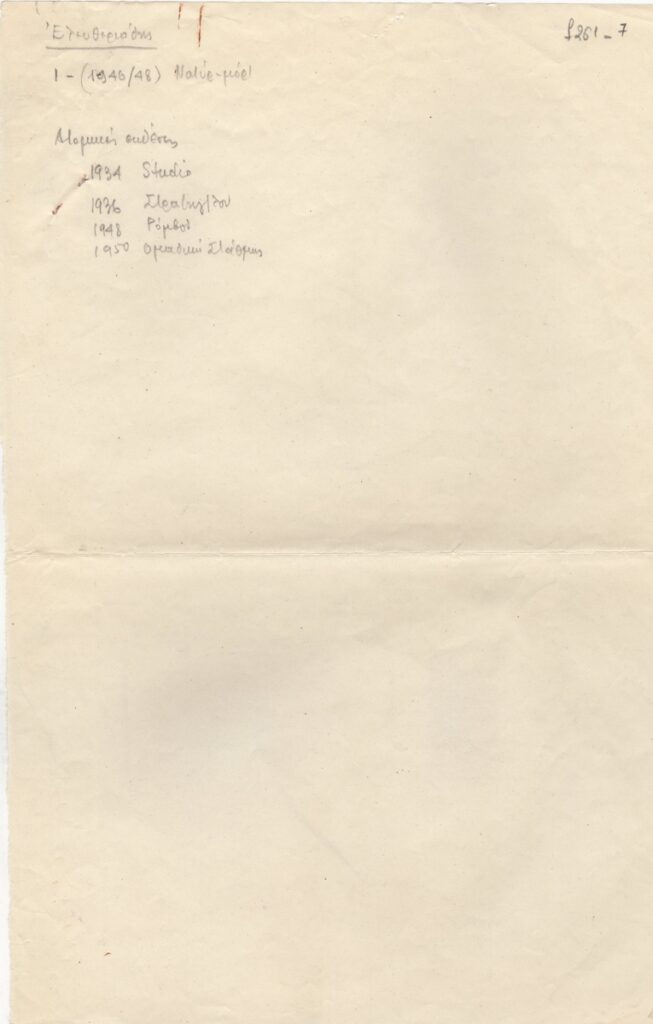 Σημειώσεις, χαρτί, 30×20 εκ., στα ελληνικά, του Τώνη Σπητέρη, για τον Τάκη Ελευθεριάδη. Περιέχει συνοπτική λίστα ατομικών εκθέσεών του.