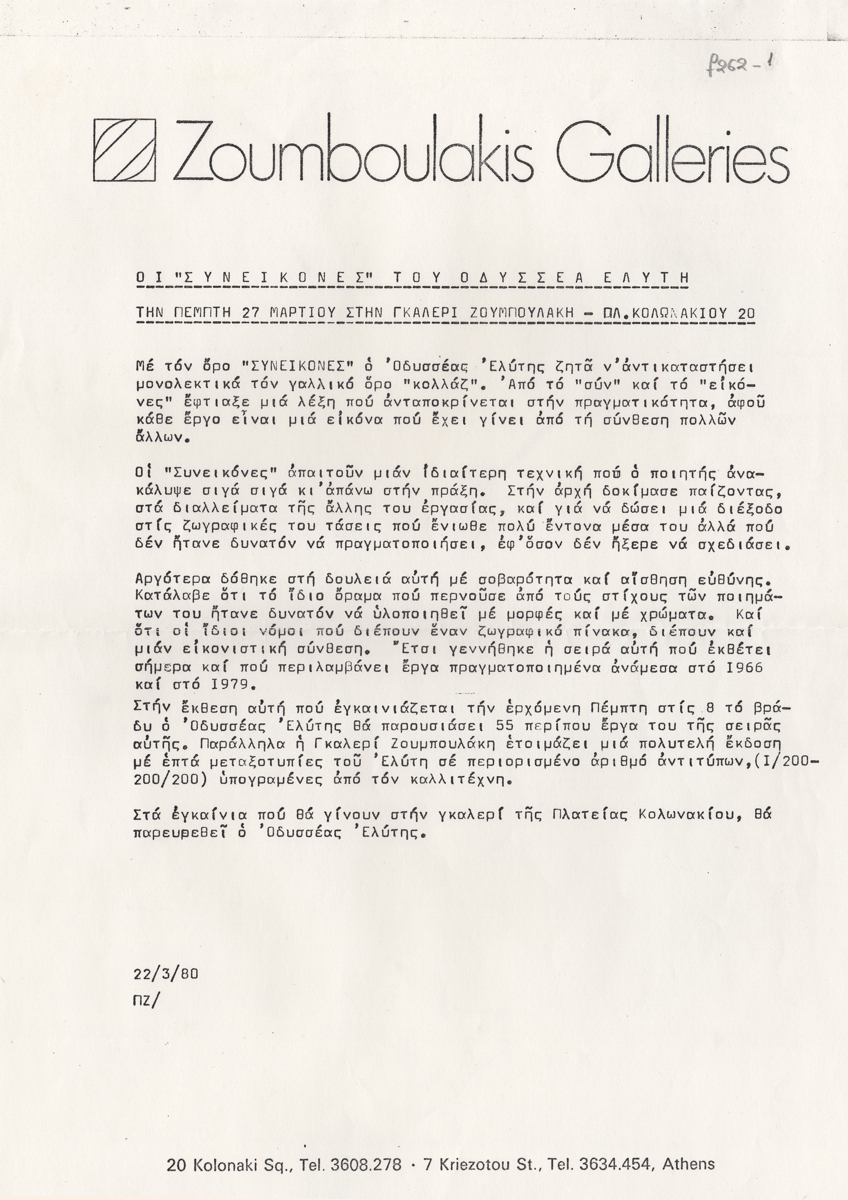 Φωτοαντίγραφο δελτίου Τύπου, δακτυλόγραφο, χαρτί, 29,5×21 εκ., στα ελληνικά, ατομικής έκθεσης του Οδυσσέα Ελύτη στην γκαλερί Ζουμπουλάκη στην Αθήνα το 1980.