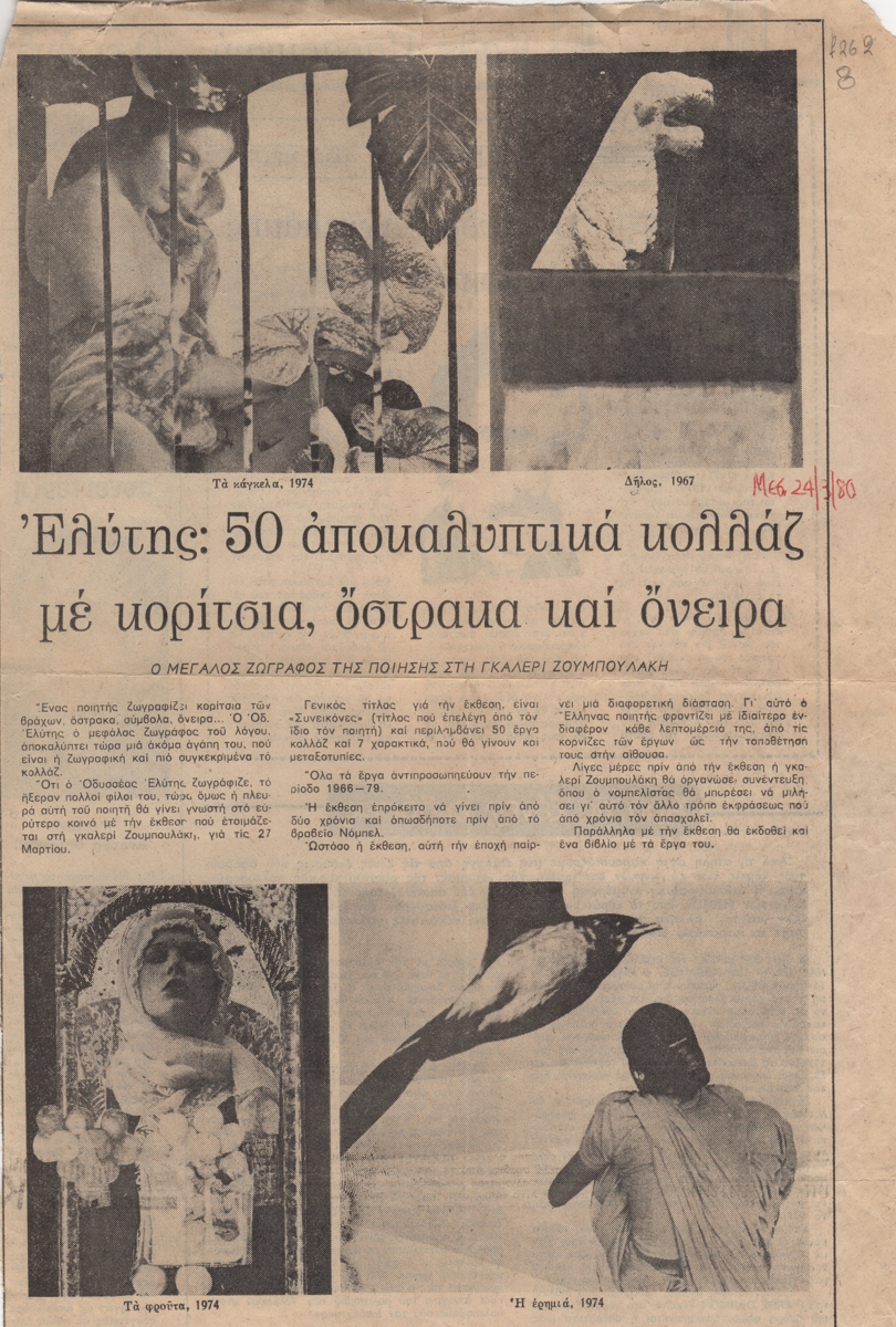Απόκομμα, χαρτί, 31×21 εκ., στα ελληνικά, δημοσίευσης κριτικής έκθεσης του Οδυσσέα Ελύτη, η οποία διεξάγεται στην Γκαλερί Ζουμπουλάκη, στην Αθήνα το 1980.