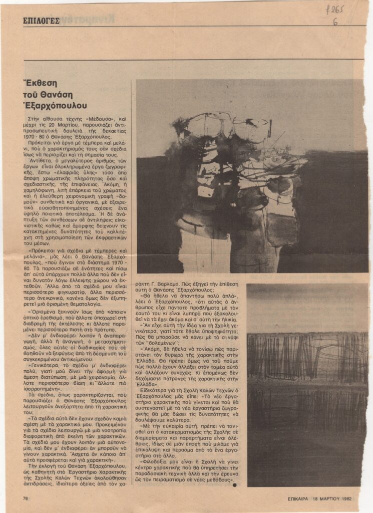 Απόκομμα, χαρτί, 29×21 εκ, στα ελληνικά, δημοσίευσης κριτικής έκθεσης του Θανάση Εξαρχόπουλου, η οποία διεξάγεται στην Γκαλερί Μέδουσα στην Αθήνα το 1982.