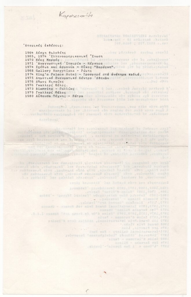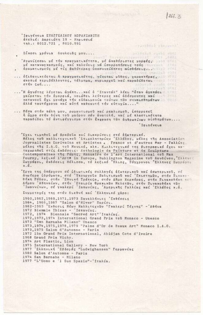 Κείμενο, δακτυλόγραφο, στα ελληνικά, 33,5×21,6 εκ. Περιέχει κείμενο της καλλιτέχνιδας και συμμετοχές σε ομαδικές εκθέσεις στην Ελλάδα και το εξωτερικό.
