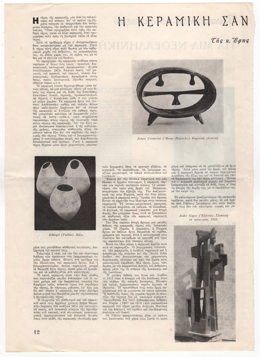 Στην πίσω όψη άρθρο της Φρ. Ευθυμιάδη-Μενεγάκη με τίτλο “Για μία νεοελληνική κεραμική”