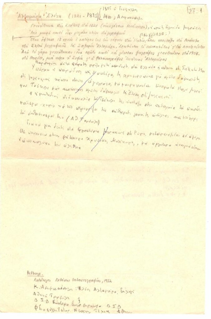 Βιογραφικό, χειρόγραφο, χαρτί, 30×20εκ, στα ελληνικά. Περιλαμβάνει προσωπικά στοιχεία και σχετική βιβλιογραφία.