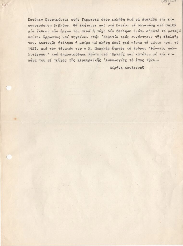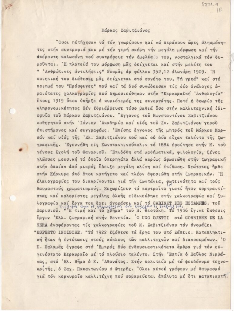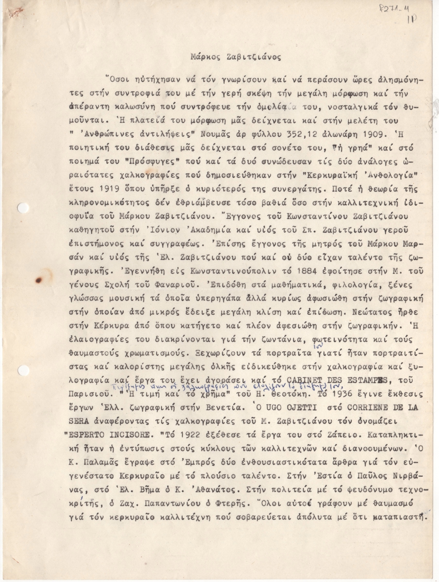 Κείμενο, δακτυλόγραφο, χειρόγραφες συμπληρώσεις, με μπλε μελάνι, στα ελληνικά, χαρτί, 2 φφ, 28,5×21,2 εκ. Αναφορά στο έργο του καλλιτέχνη με παράθεση βιογραφικών στοιχείων και κριτική για το έργο του.