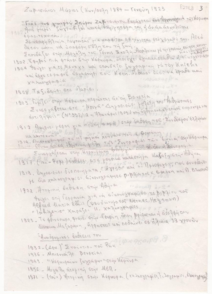 Κείμενο, χειρόγραφο, με μολύβι, στα ελληνικά, χαρτί, 29,7×21,0 εκ. Χρονολογικά οργανωμένο βιογραφικό του καλλιτέχνη. Αναφέρονται και αναδρομικές εκθέσεις και εργογραφία. Πιθανόν λείπει σελίδα όπου δινόταν βιβλιογραφία.
