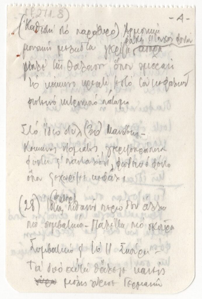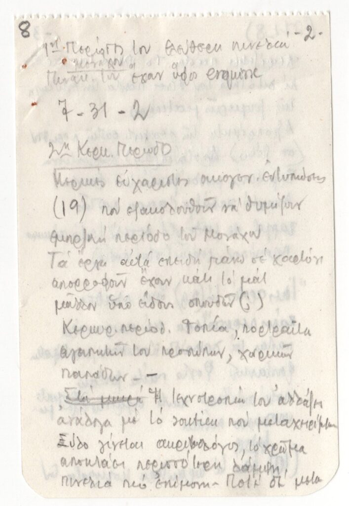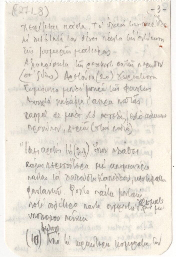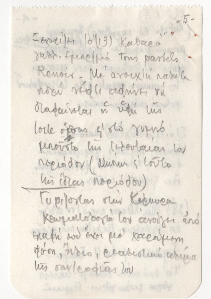 Κείμενο, χειρόγραφο, με μολύβι, στα ελληνικά, χαρτί, 8 φφ, 18,7×7,0 εκ. Σημειώσεις και κριτική για το έργο του καλλιτέχνη ανά περίοδο.