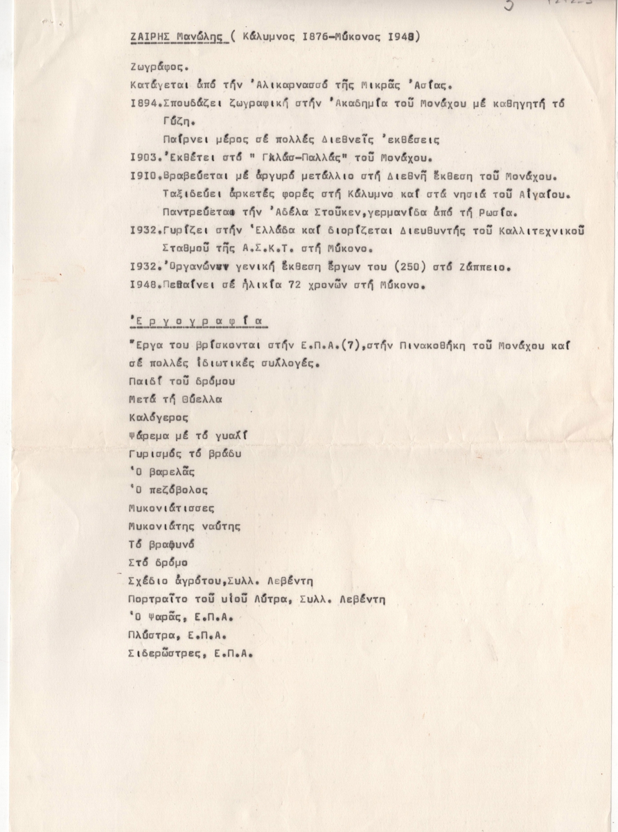 Κείμενο, χειρόγραφο, χαρτί, 2 φφ, στα ελληνικά, 29,6×21,0 εκ. Αναφορά στους σημαντικότερους σταθμούς της πορείας του καλλιτέχνη, με εργογραφία και βιβλιογραφία.