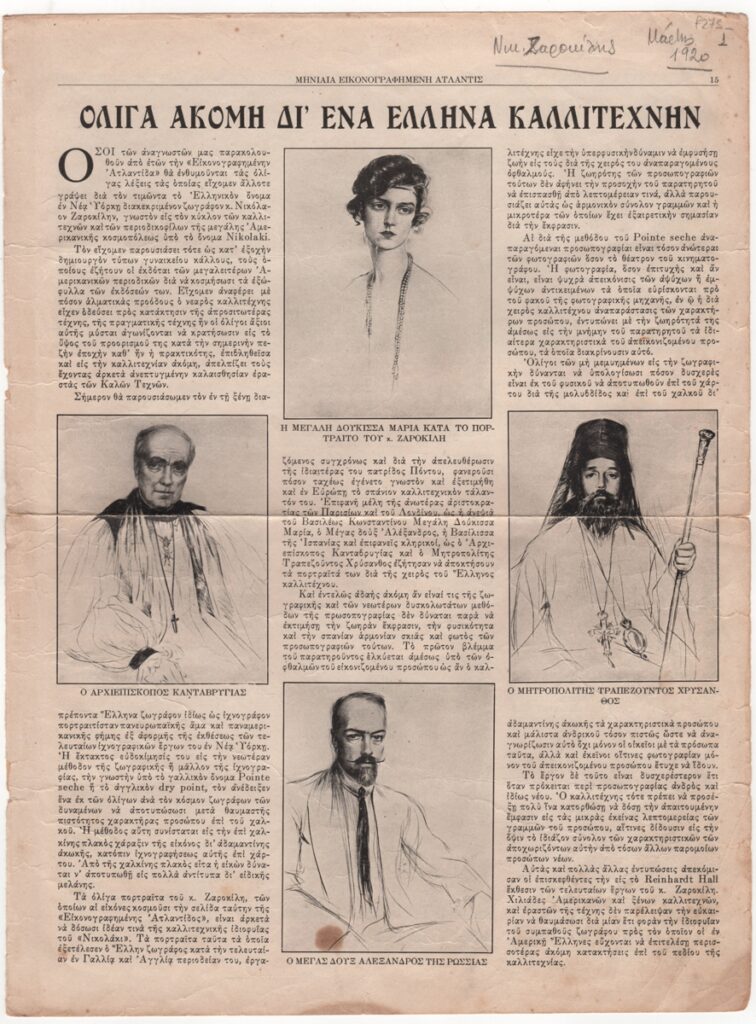 Απόκομμα περιοδικού, χαρτί, 34,0×25,3 εκ., στα ελληνικά. Αναφορά στον έλληνα καλλιτέχνη που έδρασε στην Αμερική επικεντρωμένη στις προσωπογραφίες του με την μέθοδο της “ξηρής χάραξης” (drypoint, Ponte seche) με αφορμή την έκθεση του καλλιτέχνη στην Νέα Υόρκη. Εικονογραφείται με αναπαραγωγές έργων. Στην κορυφή του αποκόμματος επιγραφή.