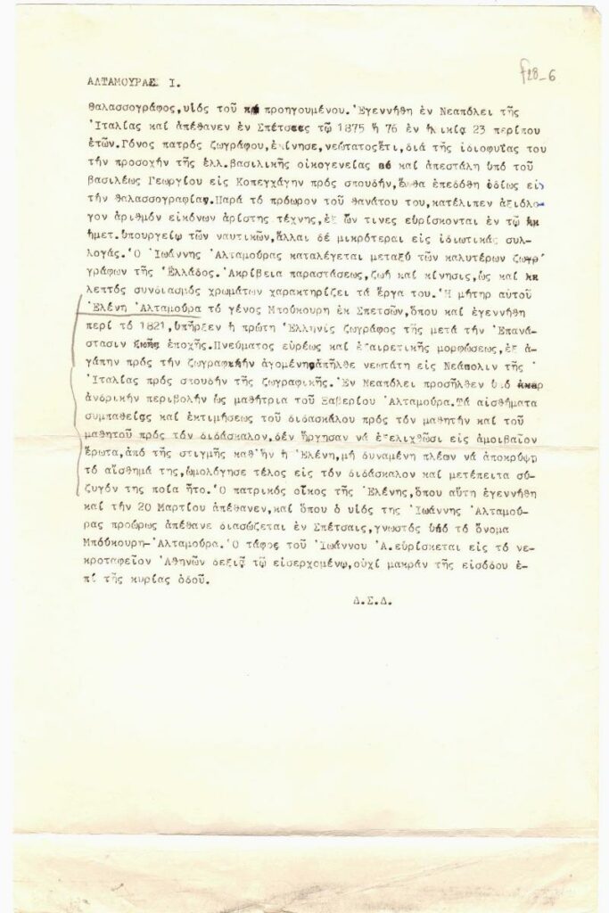 Κείμενο, δακτυλόγραφο, χαρτί, 31×21,5εκ, στα ελληνικά, για τον Ιωάννη Αλταμούρα. Περιλαμβάνει βιογραφικά στοιχεία για τον καλλιτέχνη.