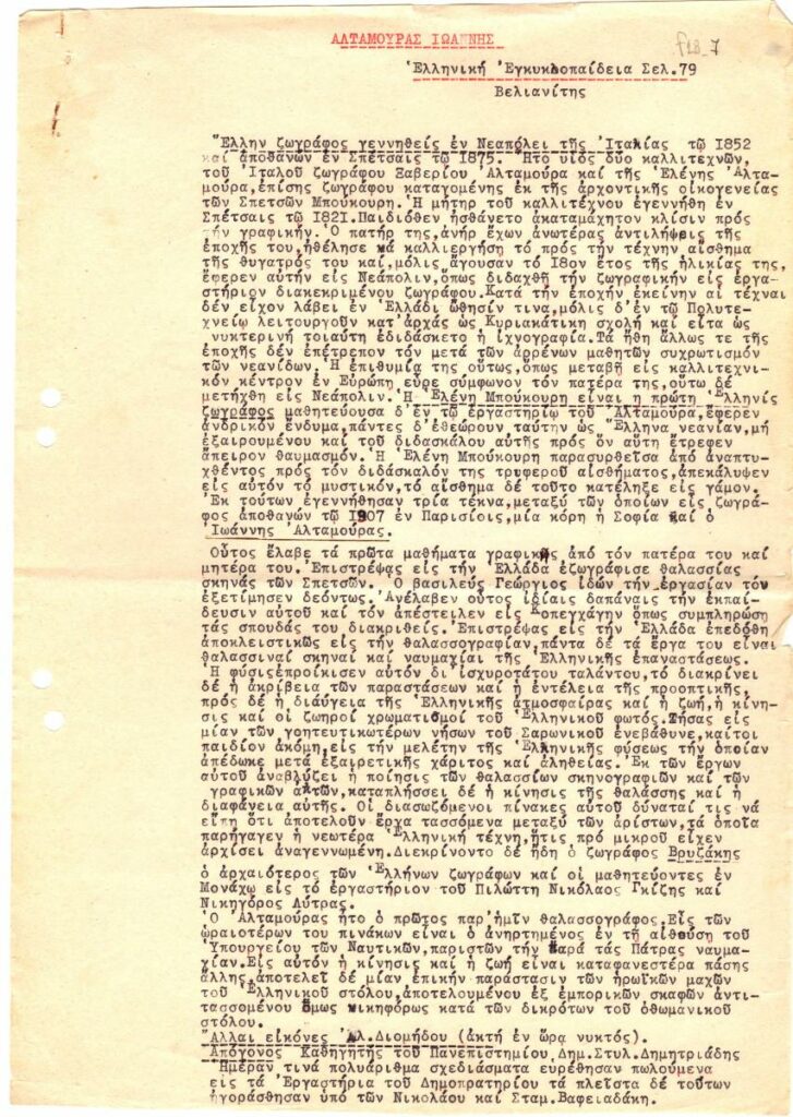 Αποδελτίωση λήμματος, δακτυλόγραφο, χαρτί, 2 φφ, 31×22εκ, στα ελληνικά, για τον Ιωάννη Αλταμούρα από την “Ελληνική Εγκυκλοπαίδεια”. Στο ίδιο, σύντομο βιογραφικό της Ελένης Αλταμούρα.