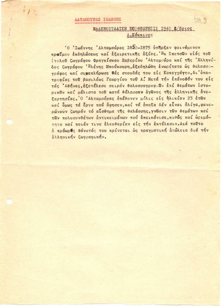 Αποδελτίωση κειμένου, δακτυλόγραφο, χαρτί, 30×22εκ, στα ελληνικά, για τον Ιωάννη Αλταμούρα.
