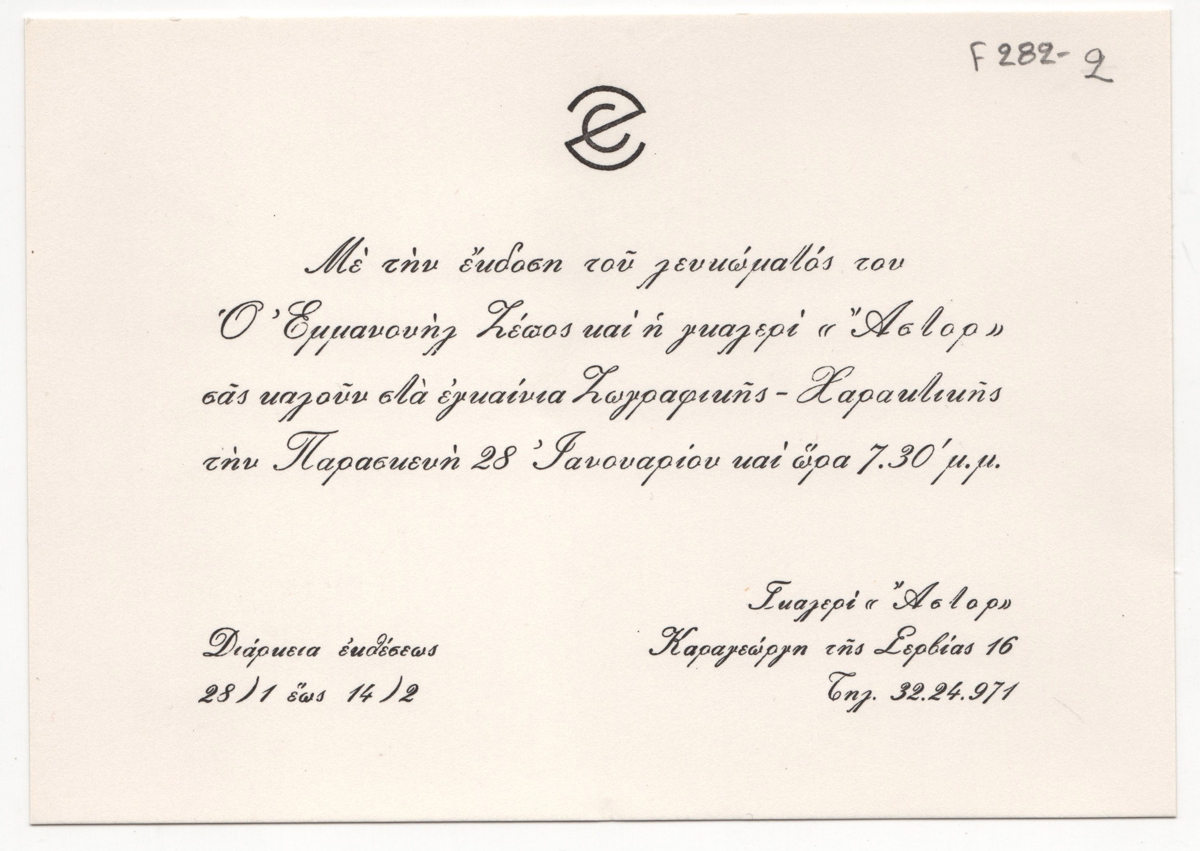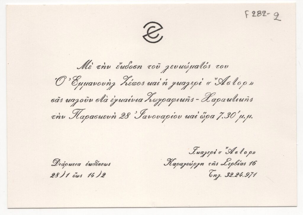 Έντυπο, μονόφυλλο, χαρτόνι, 12,0×17,0 εκ., στα ελληνικά. Αφορά την ατομική έκθεση ζωγραφικής-χαρακτικής του Εμμανουήλ Ζέπου στην Αθήνα.