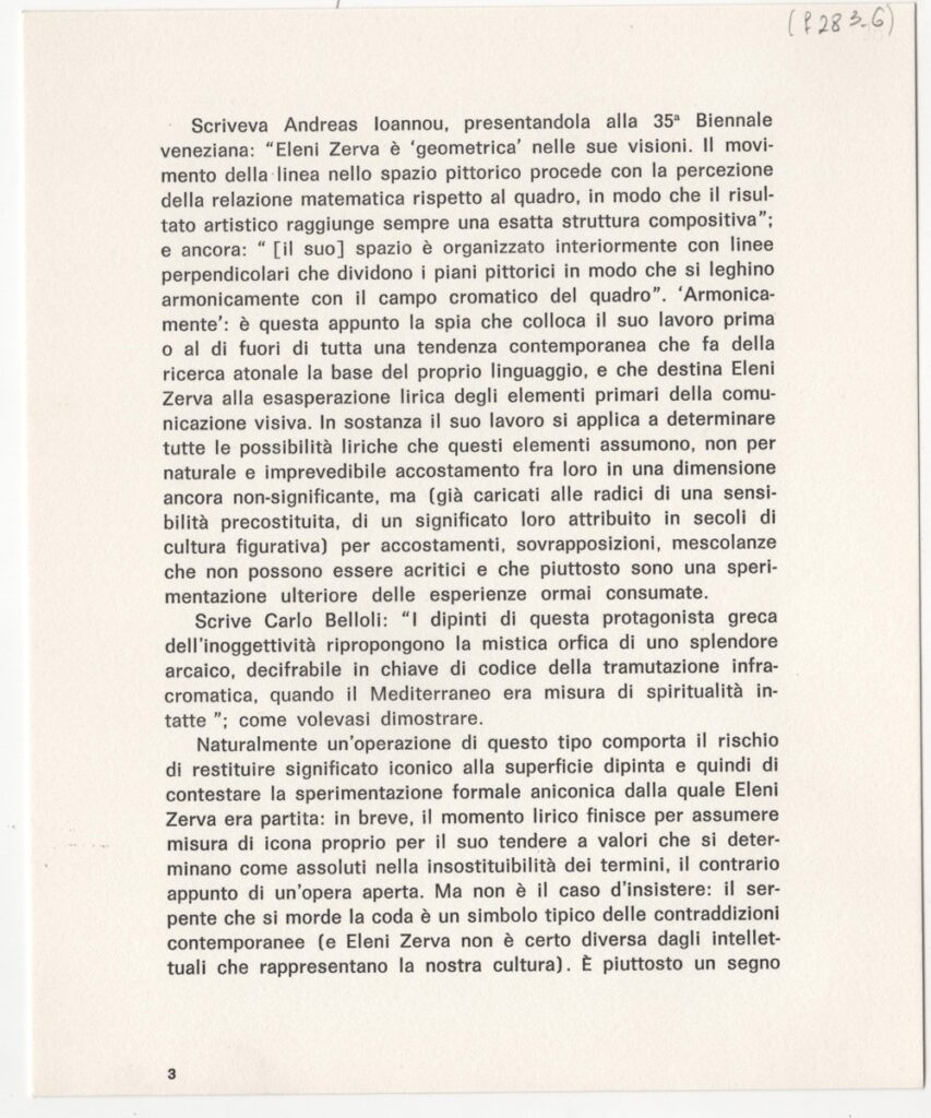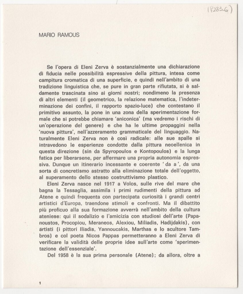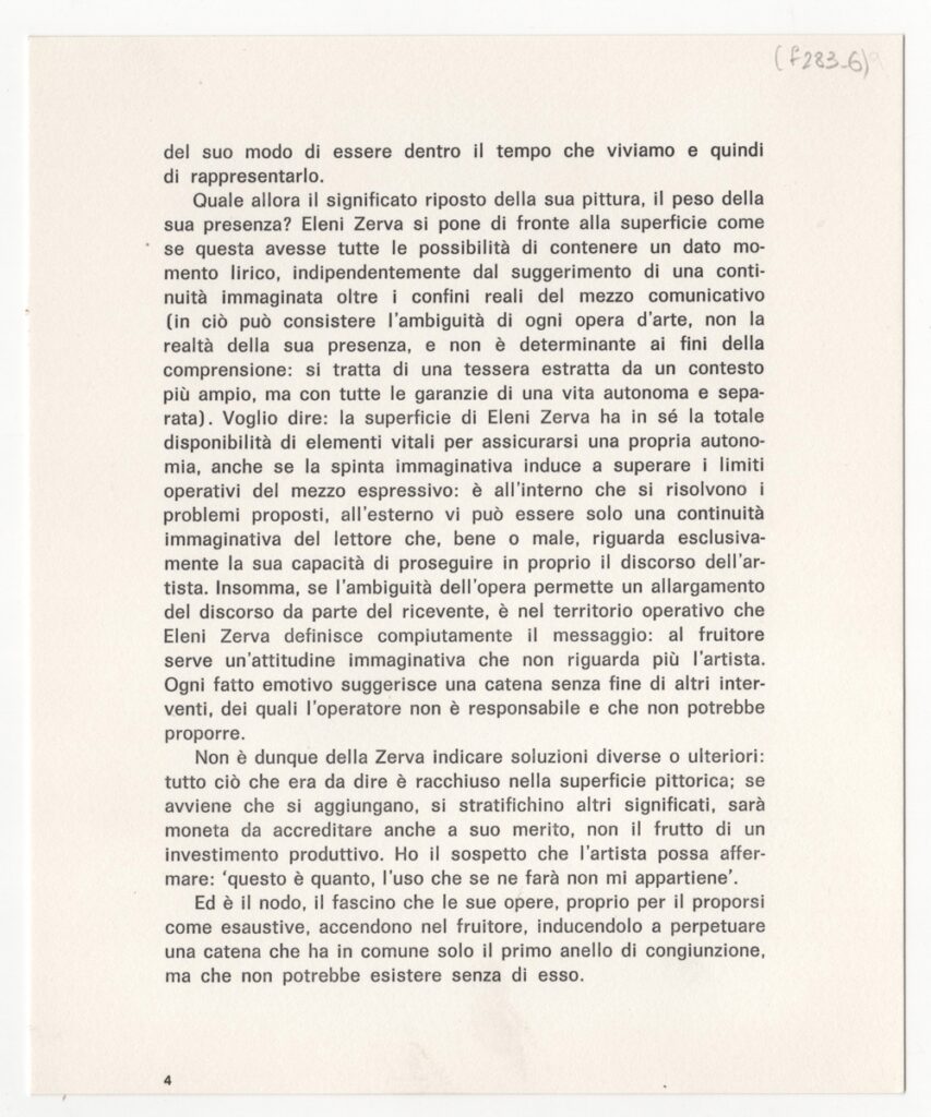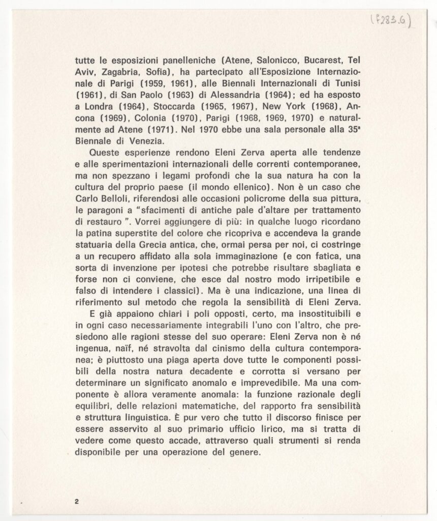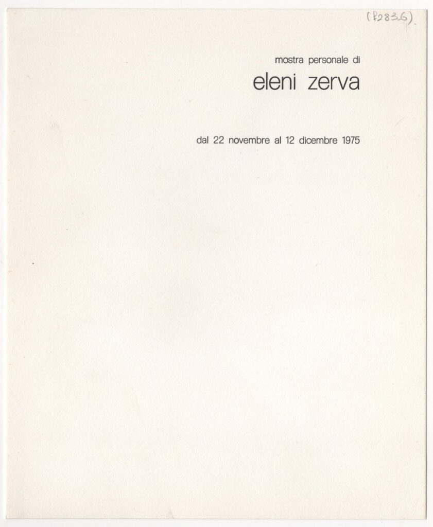 Έντυπο, δίπτυχο εξώφυλλο με 5 ένθετα μονόφυλλα, από χαρτόνι, 23,0×17,2 εκ., στα ιταλικά. Περιέχει κείμενο του Mario Ramous για το έργο της Ελένης Ζέρβα. Δίνονται σύνομα βιογραφικά στοιχεία, κατάλογος εκθέσεων. Παρατίθενται αποσπάσματα κειμένων των Ανδρέα Ιωάννου (μεταφρασμένο στα ιταλικά) και Carlo Belloli.