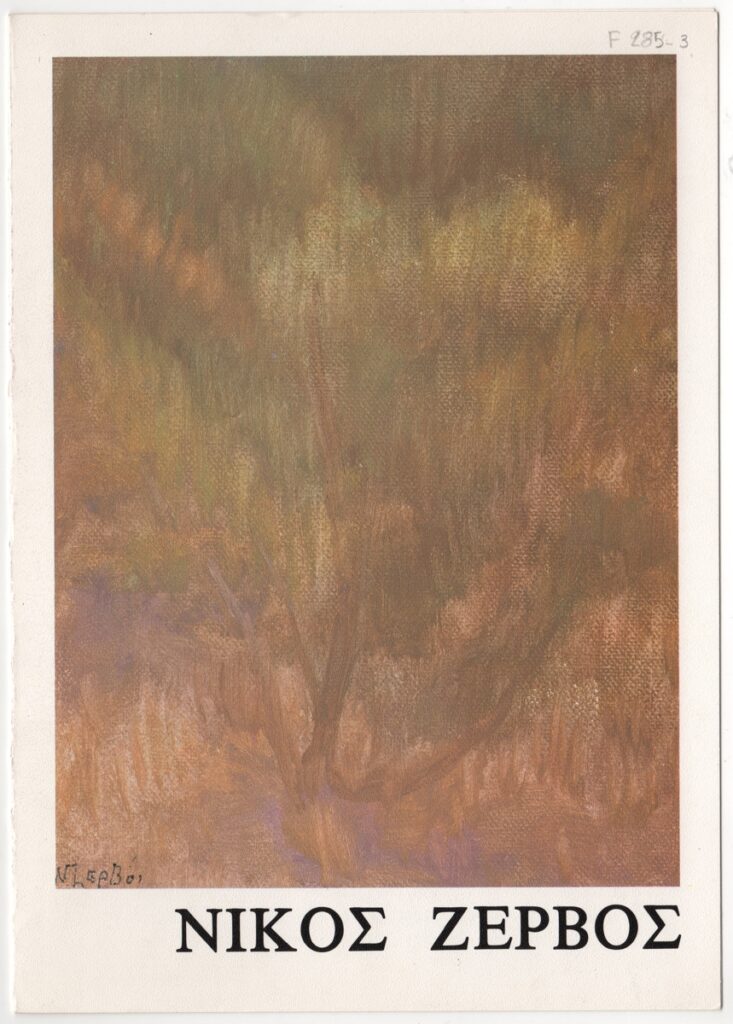 Έντυπο, δίπτυχο, χαρτόνι, 24,0×17,0 εκ., στα ελληνικά. Αφορά στην έκθεση του ζωγράφου Νίκου Ζερβού στην Αθήνα το 1979. Περιέχει σύντομο βιογραφικό σημείωμα. Εικονογραφείται με αναπαραγωγή έργου στο εξώφυλλο.