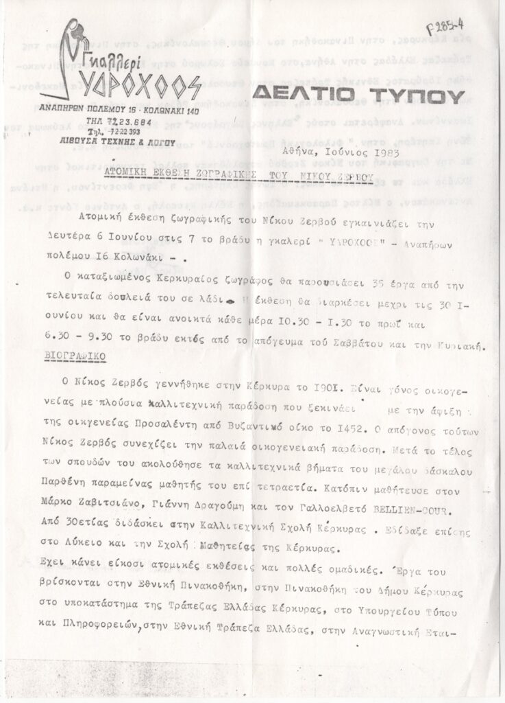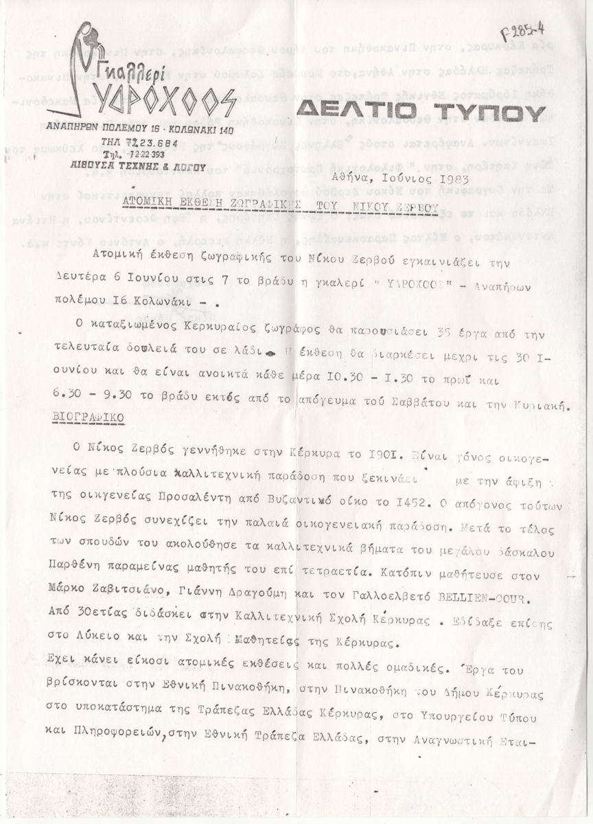 Κείμενο, δακτυλόγραφο, χαρτί, 29,8×21,0 εκ. Δελτίο τύπου της ατομικής έκθεσης ζωγραφικής του Νίκου Ζερβού στην Αθήνα το 1983. Περιέχει βιογραφικά στοιχεία, σπουδές, καθώς και κατάλογο κριτικών που σχολίασαν το έργο του.