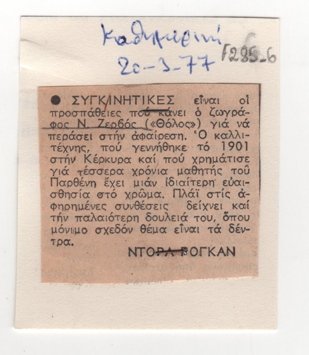 Απόκομμα εφημερίδας, χαρτί, 4,5×5,0 εκ., στα ελληνικά. Το δημοσίευμα αποτελεί κριτική για την ατομική έκθεση του ζωγράφου Νίκου Ζερβού του Ντόρα Ρογκάν. Στερεωμένο στην πίσω όψη αποκόμματος εντύπου, από χαρτόνι, 7,2×6,0 εκ., στα γαλλικά, όπου υπάρχει επιγραφή.
