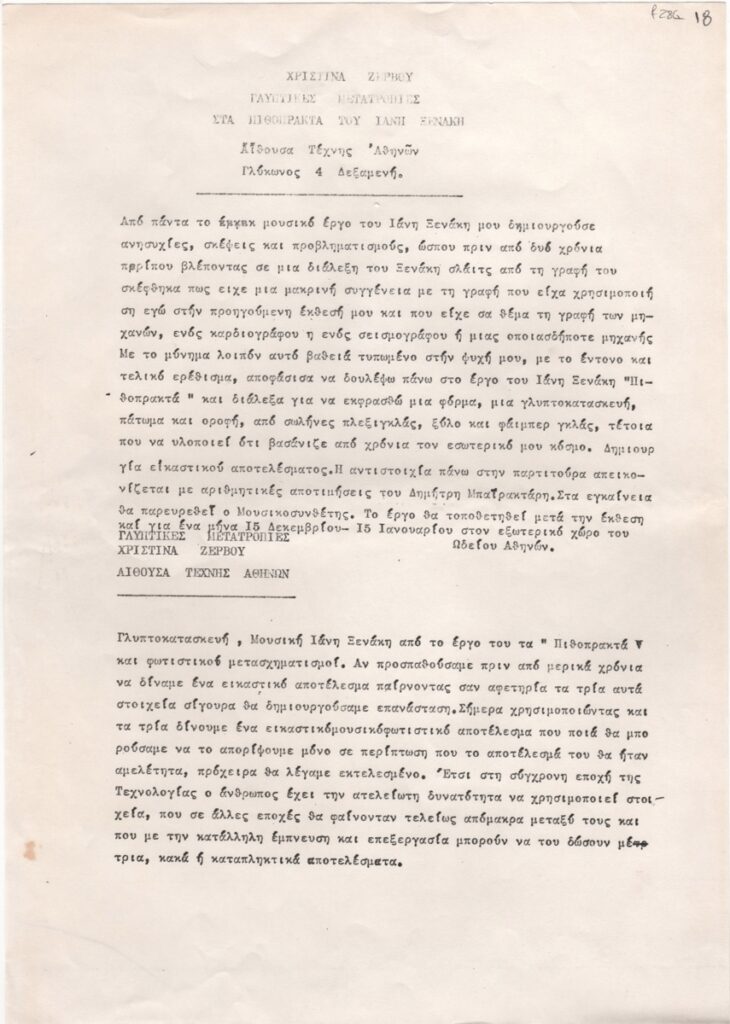 Κείμενο, δακτυλόγραφο, χαρτί, 29,7×21,0 εκ., στα ελληνικά. Σχολιασμός των έργων που παρουσιάζονται στην ατομική έκθεση της Χριστίνας Ζερβού στην Αθήνα το 1982. Πρόκειται για εικαστικές δημιουργίες με αφετηρία του έργο του Ιάνη Ξενάκη “Πιθοπρακτά”. Το έργο τοποθετήθηκε μετά την έκθεση για ένα μήνα (15/12/1982-15/01/1983) στον εξωτερικό χώρο του Ωδείου Αθηνών.