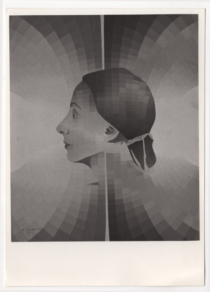 Φωτογραφία έργου, α/μ, 17,8×13,0 εκ. Στην πίσω όψη επιγραφή και σφραγίδα φωτογράφου. Στο έργο απεικονίζεται και η μορφή της καλλιτέχνιδας.