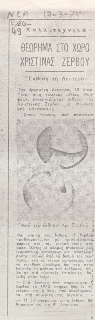 Φωτοαντίγραφο αποκόμματος εφημερίδας, χαρτί, 16,5×5,0 εκ., στα ελληνικά. Αναγγελία της ατομικής έκθεσης της Χριστίνας Ζερβού στην Αθήνα το 1974. Εικονογραφείται με αναπαραγωγή έργου. Πάνω από το απόκομμα επιγραφή.