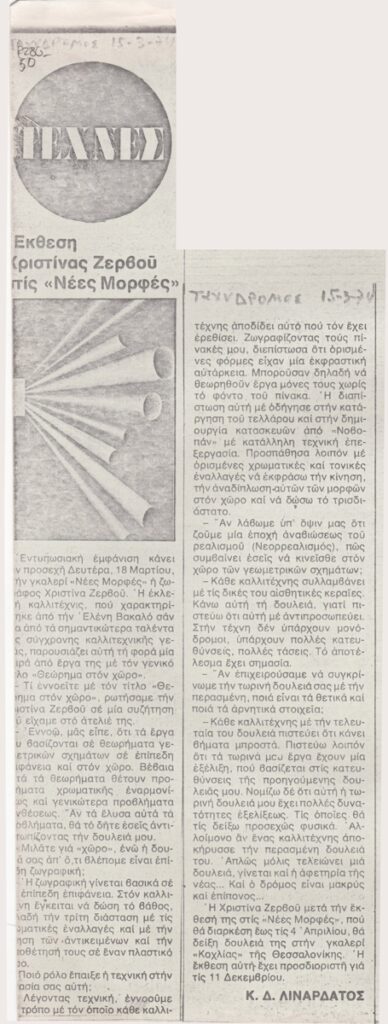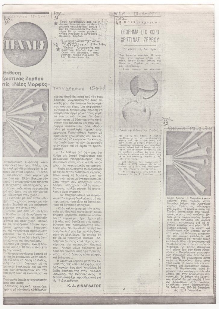 Φωτοαντίγραφο αποκόμματος, χαρτί, 22,2×4,7 εκ., στα ελληνικά. Συνέντευξη της ζωγράφου Χριστίνας Ζερβού στον Κ.Δ. Λιναρδάτου με αφορμή τα εγκαίνια της ατομικής της έκθεσης στην Αθήνα το 1974,. Εικονογραφείται με αναπαραγωγή έργου. Πάνω από το απόκομμα επιγραφή.