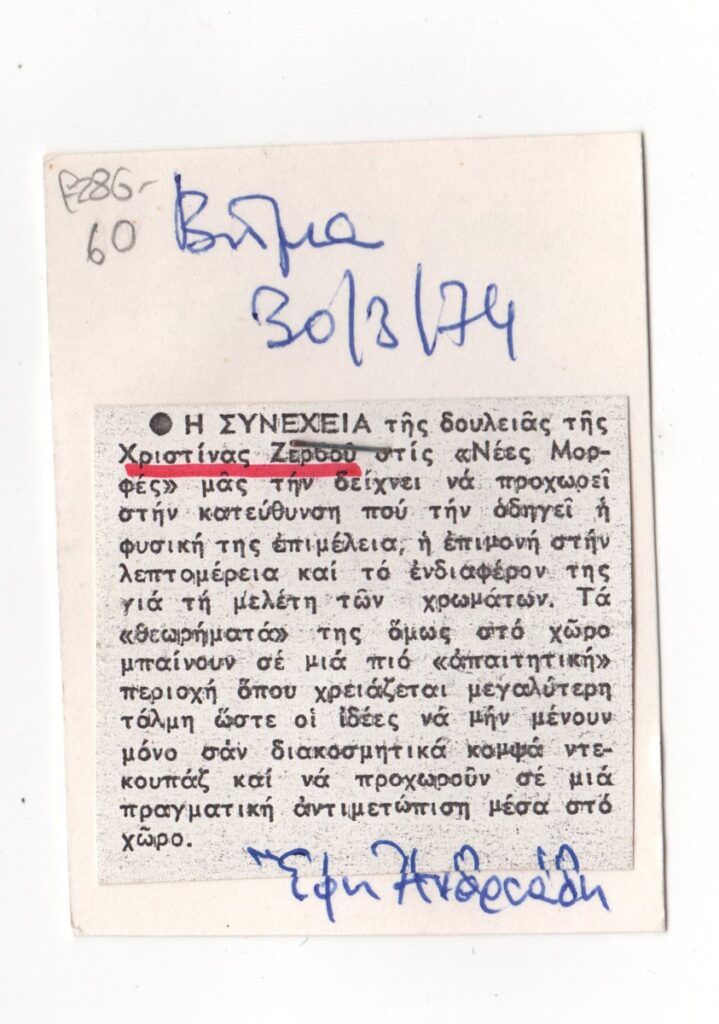 Φωτοαντίγραφο αποκόμματος εφημερίδας, χαρτί, 4,5×5,0 εκ., στα ελληνικά. Κριτική της ατομικής έκθεσης της Χριστίνας Ζερβού στην Αθήνα το 1984. Στηρίζεται σε απόκομμα εντύπου, από χαρτόνι, 7,5×5,5 εκ. Πάνω στο απόκομμα επιγραφή.