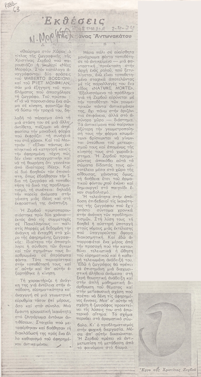 Φωτοαντίγραφο αποκόμματος εφημερίδας, χαρτί, 28,0×10,5 εκ., στα ελληνικά. Κριτική για την ατομική έκθεση της Χριστίνας Ζερβού στην Αθήνα το 1974. Εικονογραφείται με αναπαραγωγή έργου. Κοντά στον τίτλο επιγραφή.