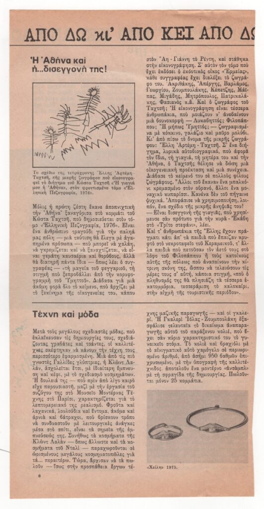 Απόκομμα εφημερίδας, χαρτί, 30,0×15,3 εκ., στα ελληνικά. Δημοσίευμα σχετικά με την δημιουργία της νέας σειράς κοσμημάτων της γαλλίδας γλύπτριας Claude Lalanne, τα δικαιώματα παραγωγής της οποίας εξασφάλισε η Γκαλερία Ιόλας-Ζουμπουλάκη. Εικονογραφείται με αναπαραγωή φωτογραφίας.